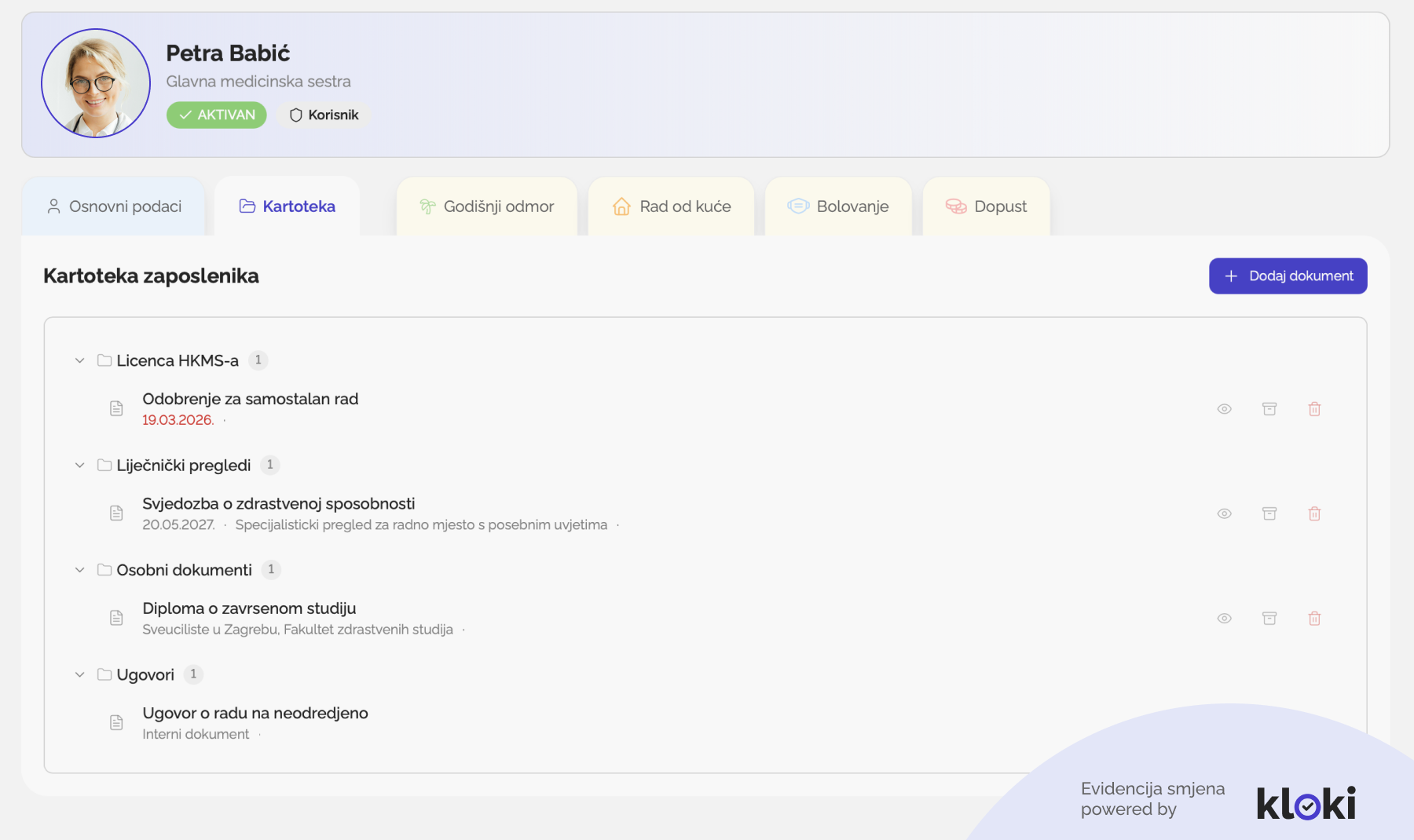 Digitalna baza certifikata unutar Klokija osigurava da vas sustav na vrijeme obavijesti o isteku licence, što je ključno za usklađenost sa zakonima i pravilnicima o zaštiti na radu (NN 71/14, 118/14, 154/14, 94/18, 96/18).